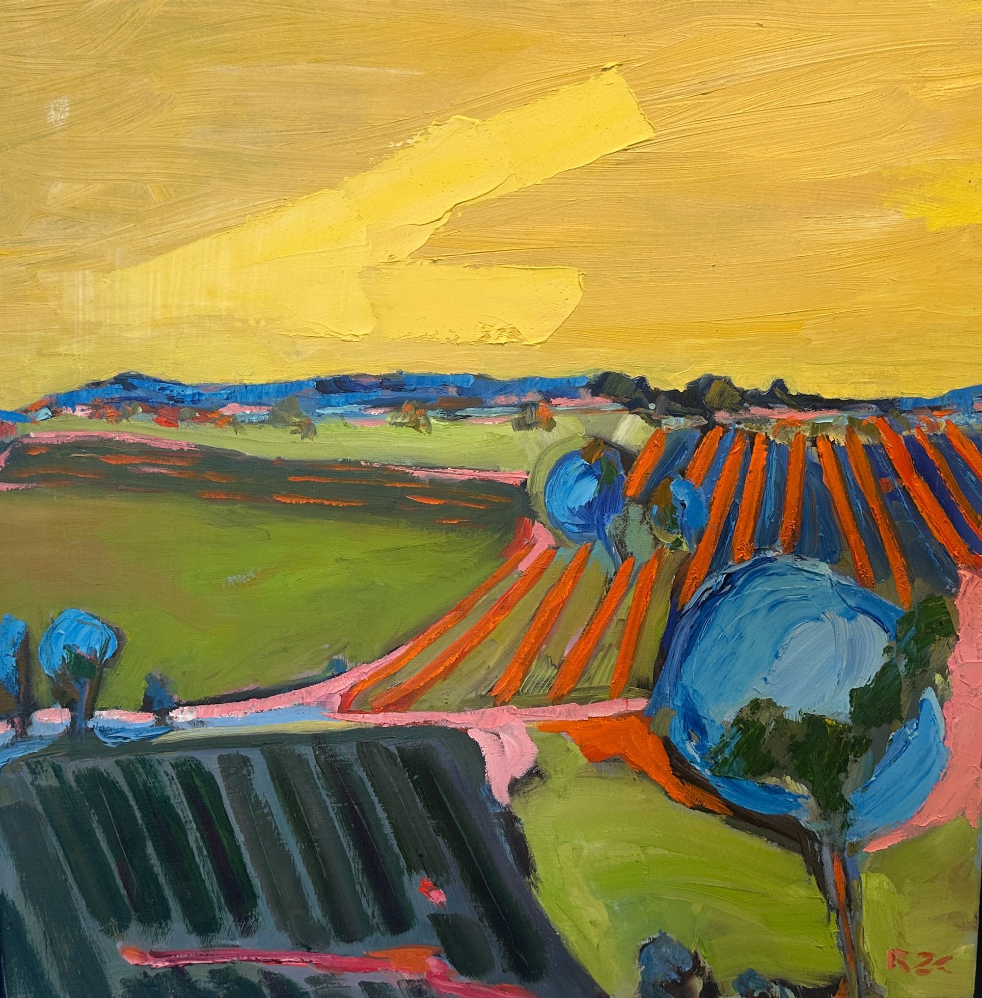 Contemporary abstract landscape of strawberry fields in Ventura County, Calif. Oil on canvas. 20 in. by 20 in. Framed. Black.